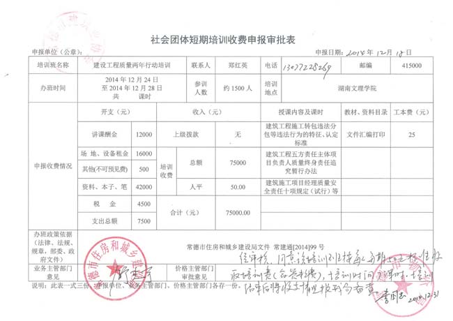 《常德市建设工程质量两年行动宣贯培训班收费审批表》