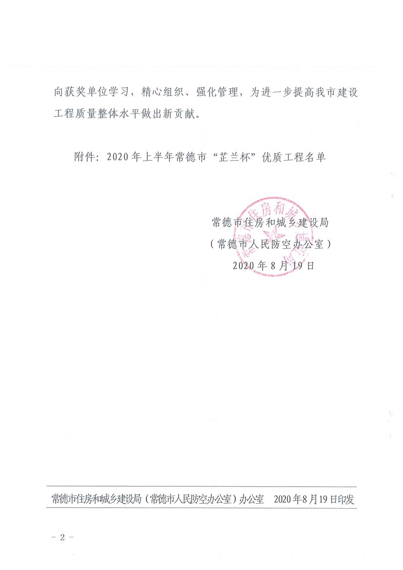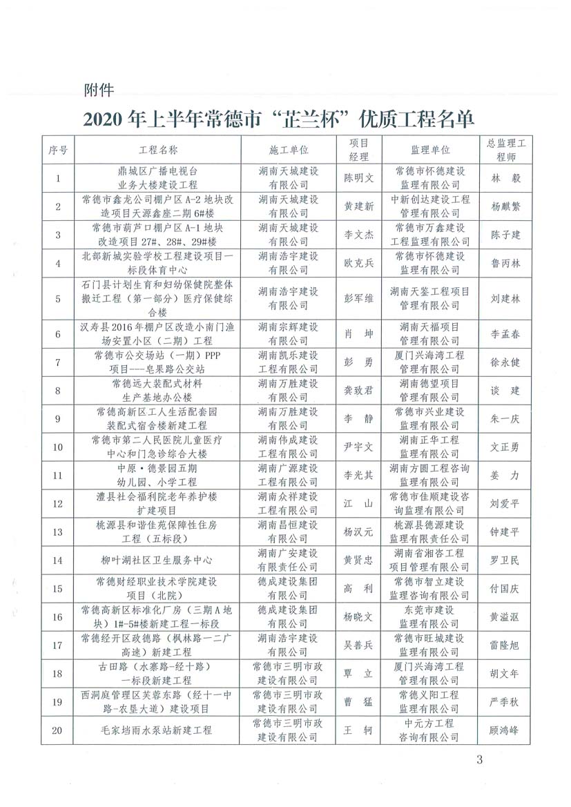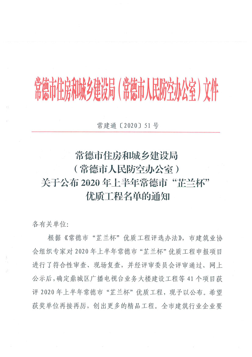 关于公布2020年上半年常德市“芷兰杯”优质工程名单的通知